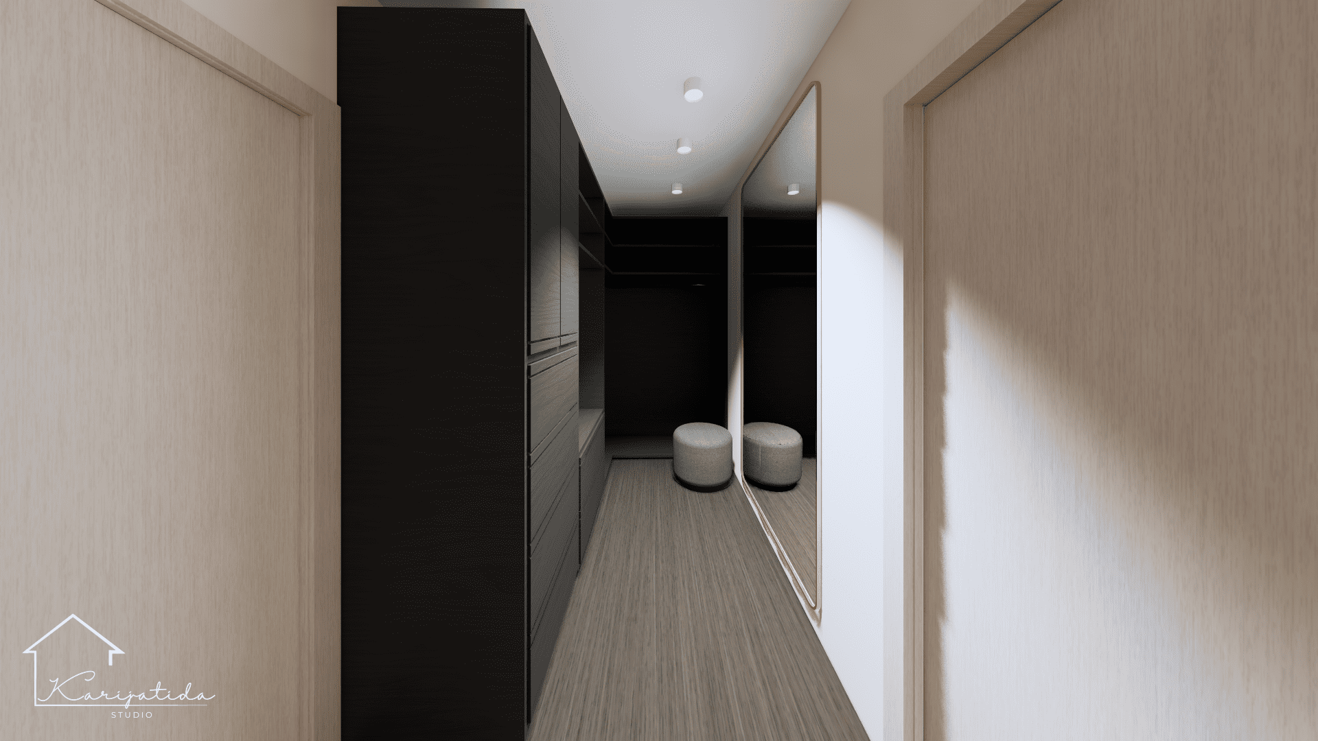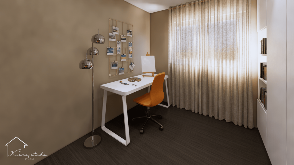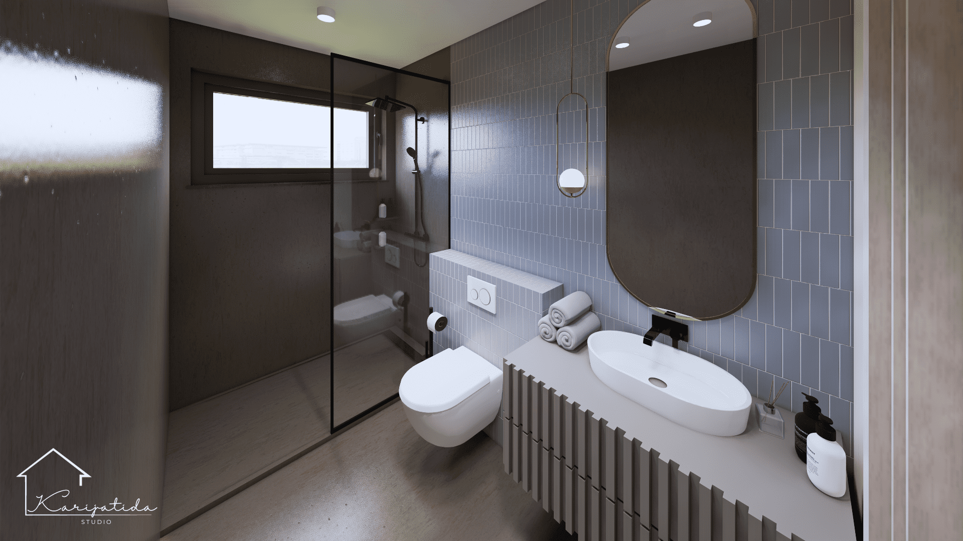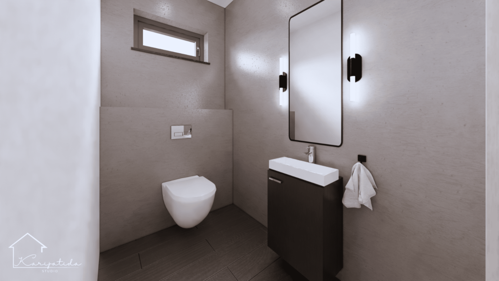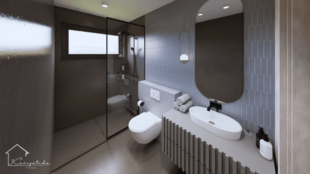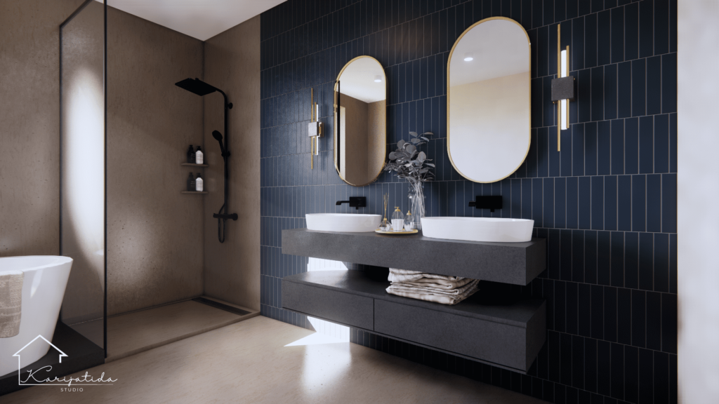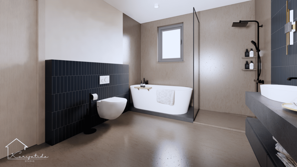 Zemljana paleta boja prostoru daje umirujuć i topao dojam koji smo ”razbijali” crnim detaljima i odvažnijom bojom keramičkih pločica u kupaonicama.
