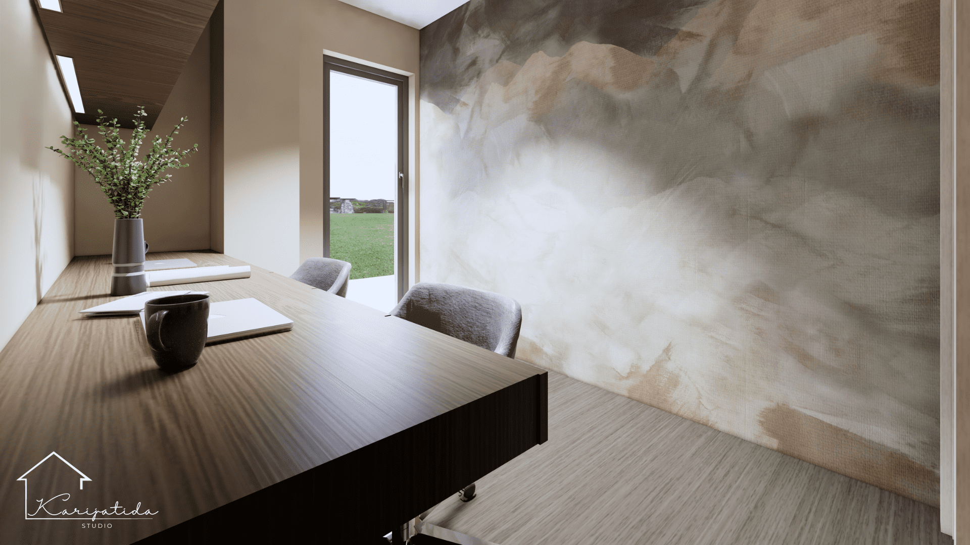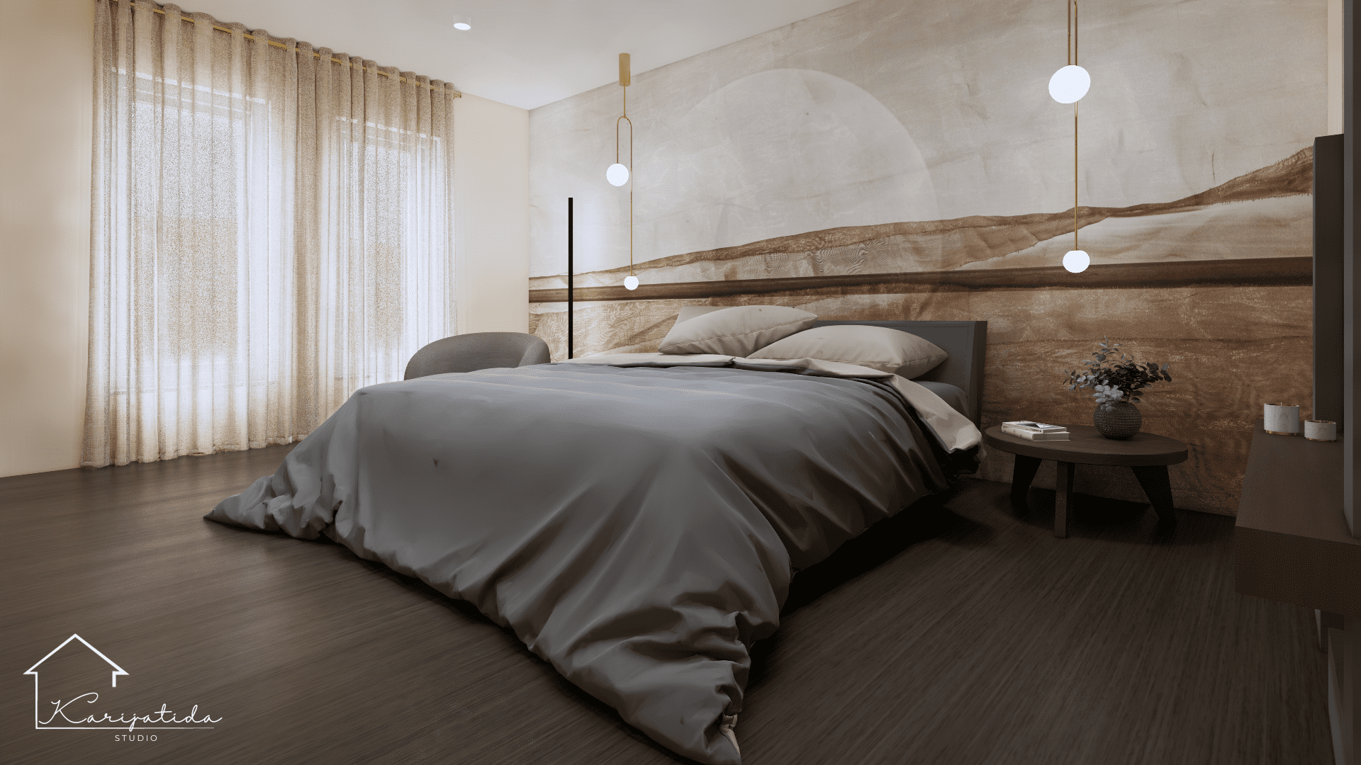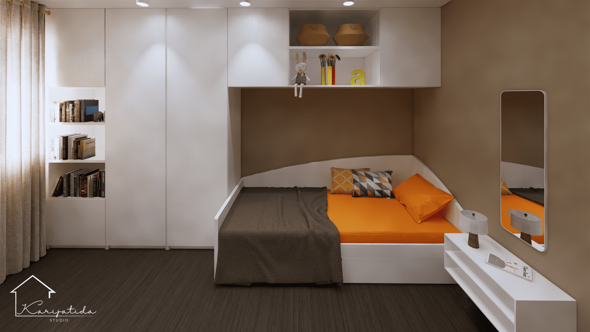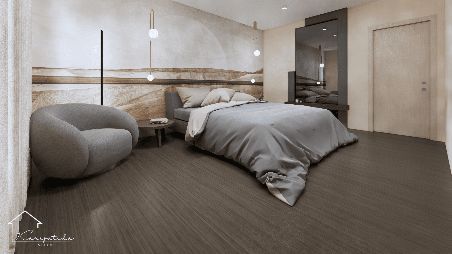 Zemljana paleta boja prostoru daje umirujuć i topao dojam koji smo ”razbijali” crnim detaljima i odvažnijom bojom keramičkih pločica u kupaonicama.