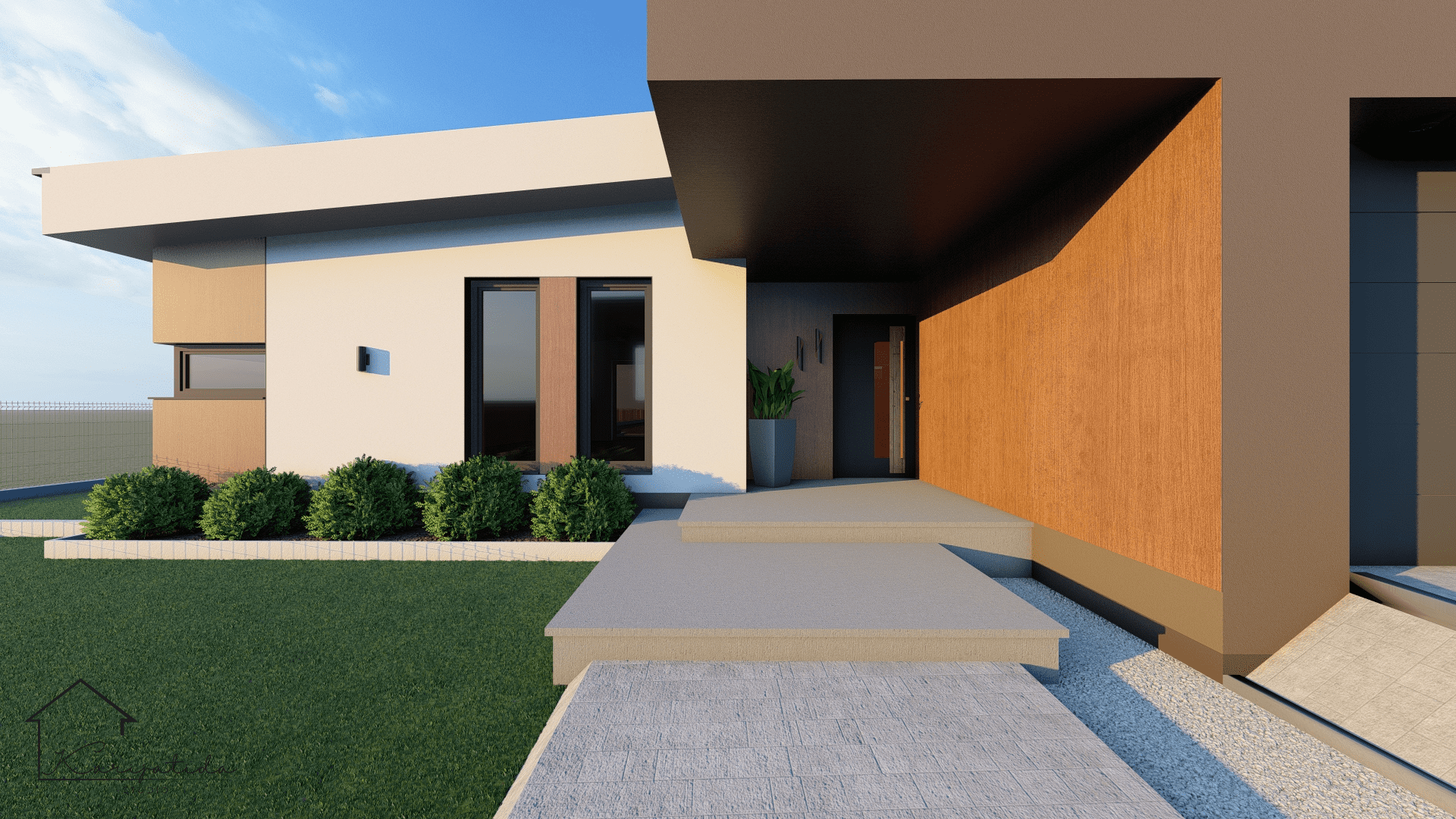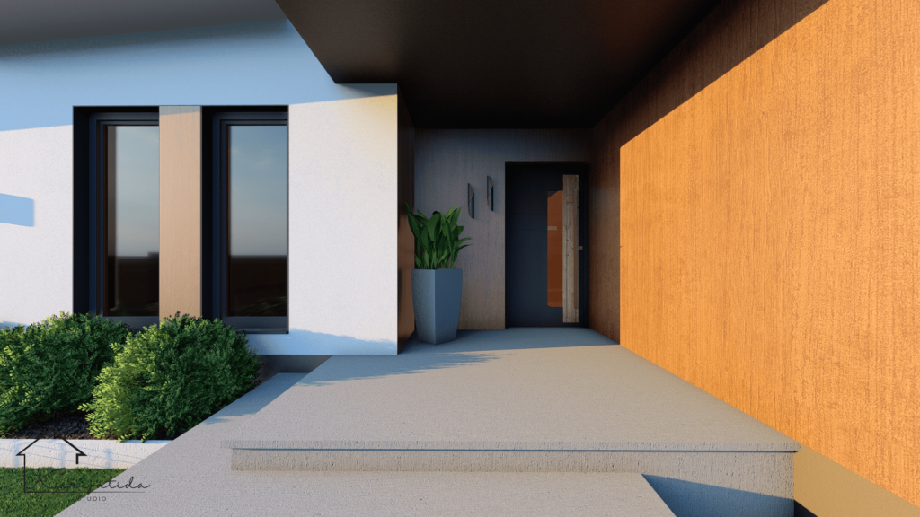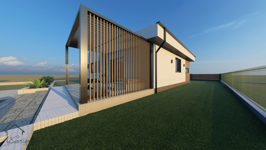 Kombinacija bijele i smeđe fasade, te fasadne obloge u imitaciji drva, uklapa se u kompletan krajobraz naselja, a blagi nagib krova pruža elegantan izgled objekta.