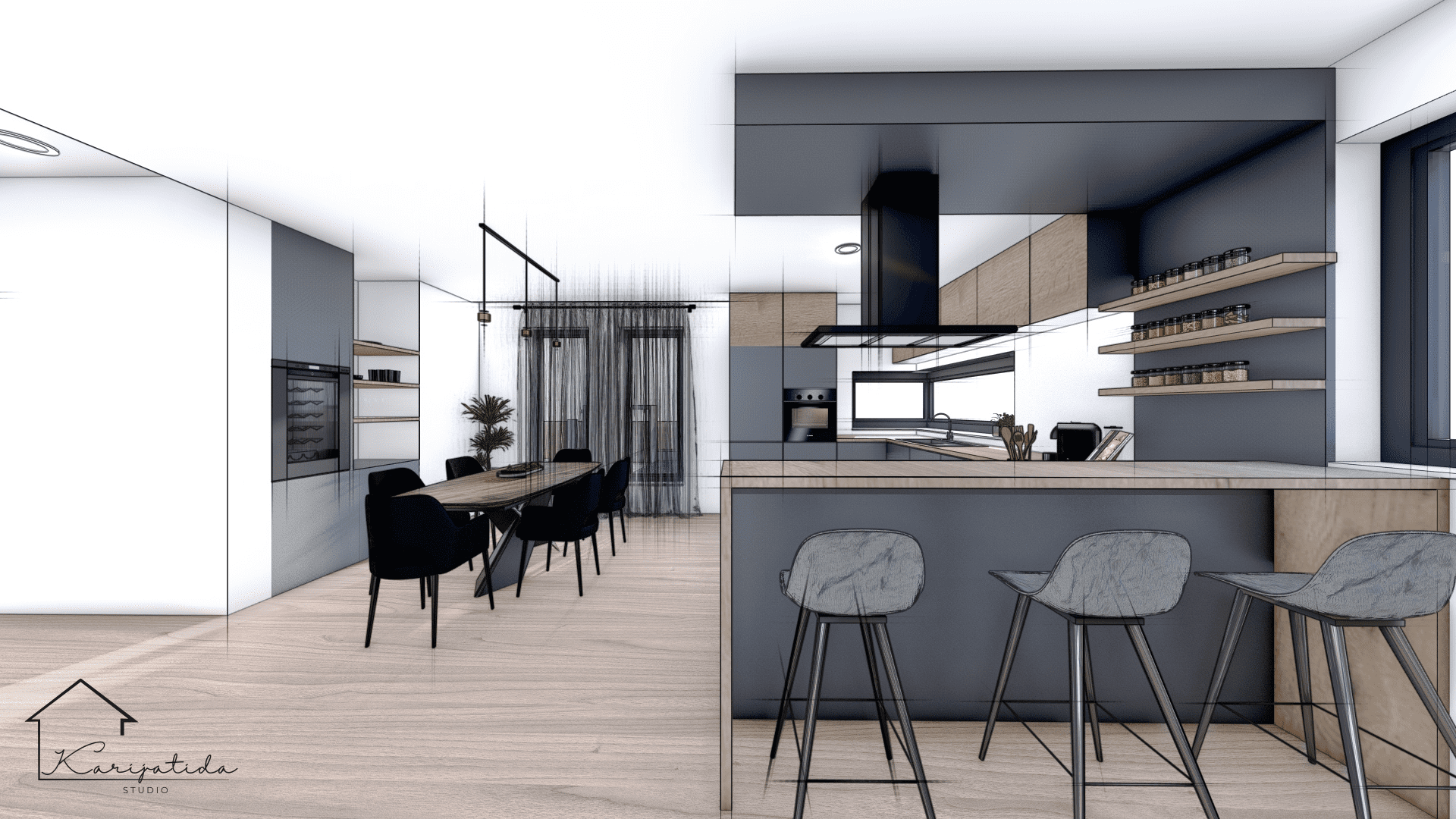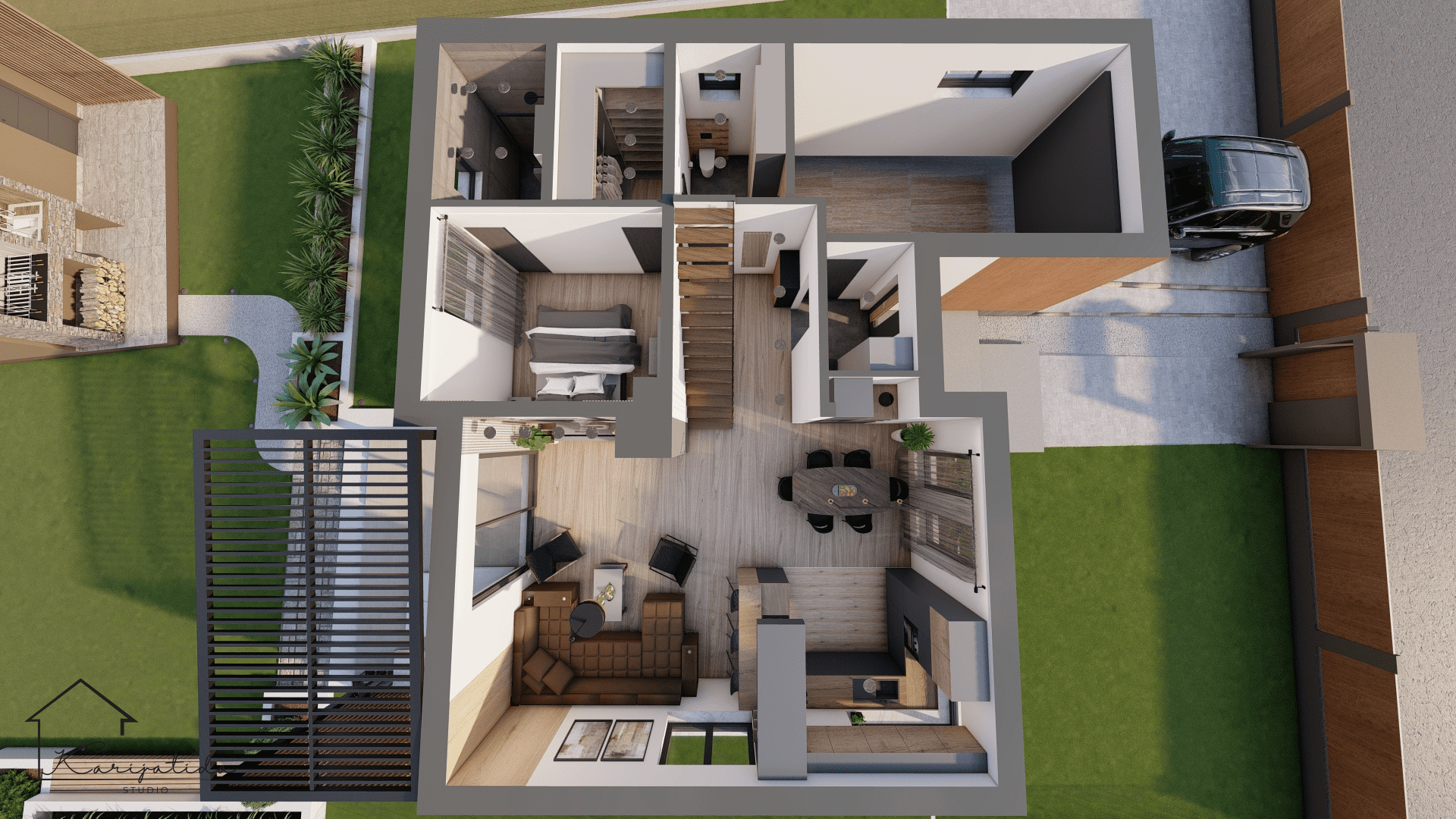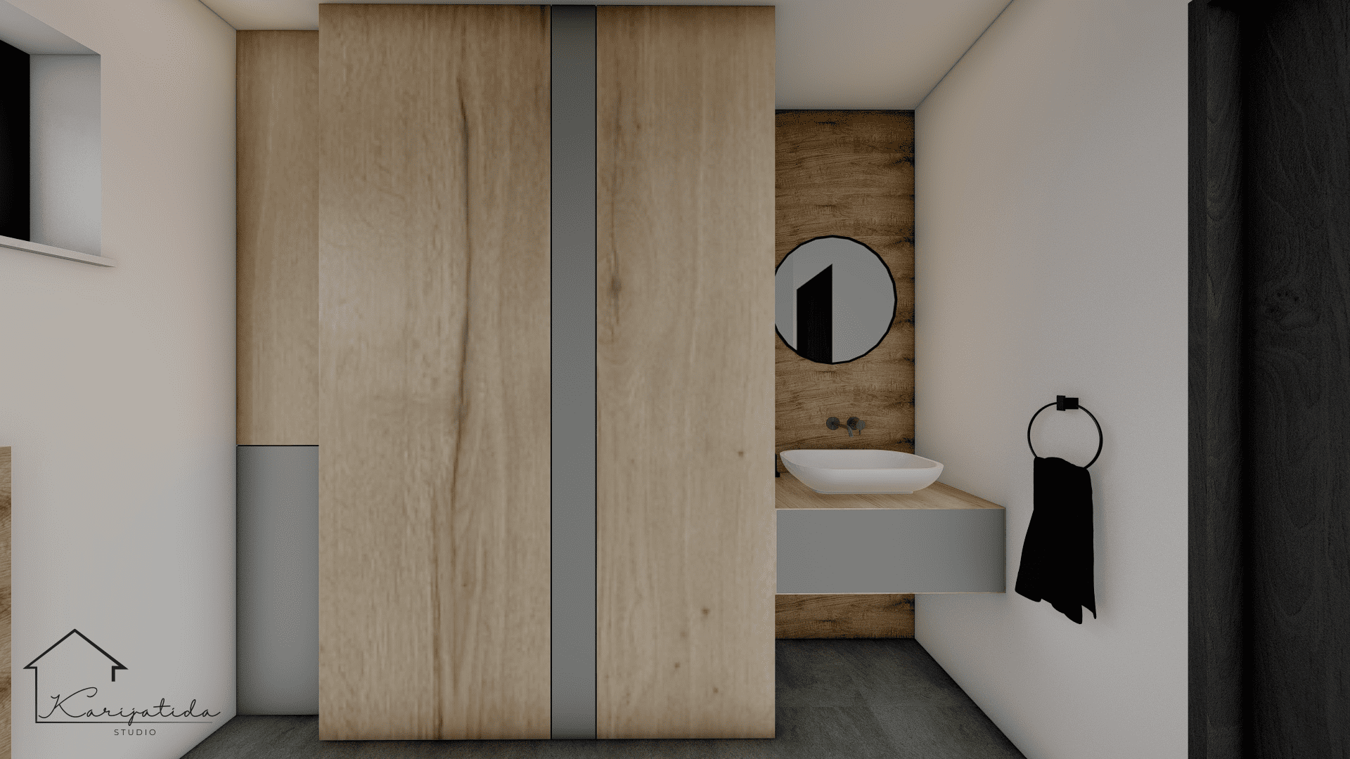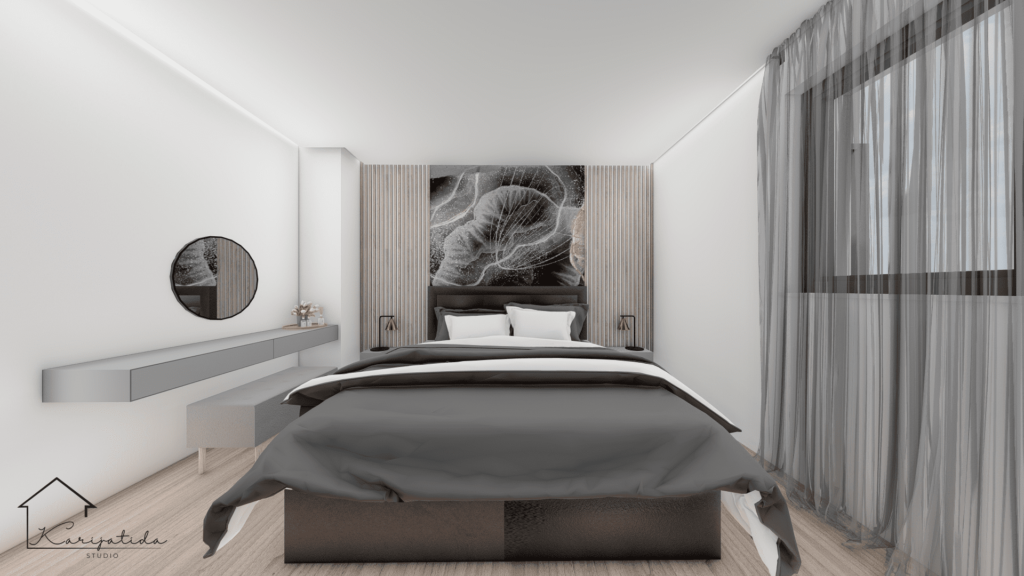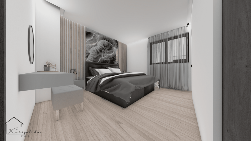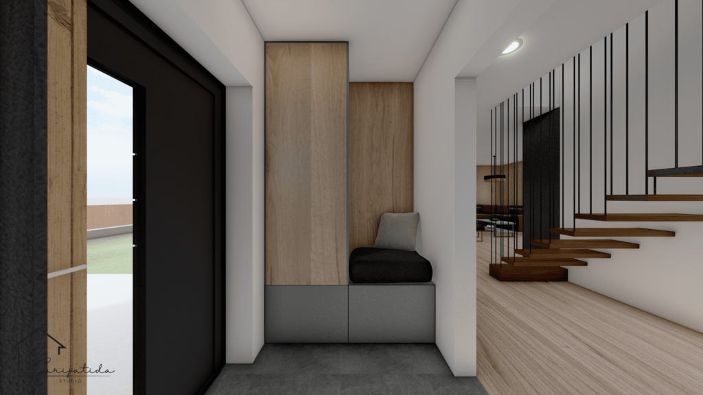 Predmet projekta bilo je prizemlje obiteljske kuće koje se sastoji od ulaznog prostora, gostinjskog toaleta koji je ujedno i praonica, roditeljske spavaće sobe sa pripadajućom garderobom i kupaonicom te otvorenog prostora kuhinje, blagovaonice i dnevnog boravka.