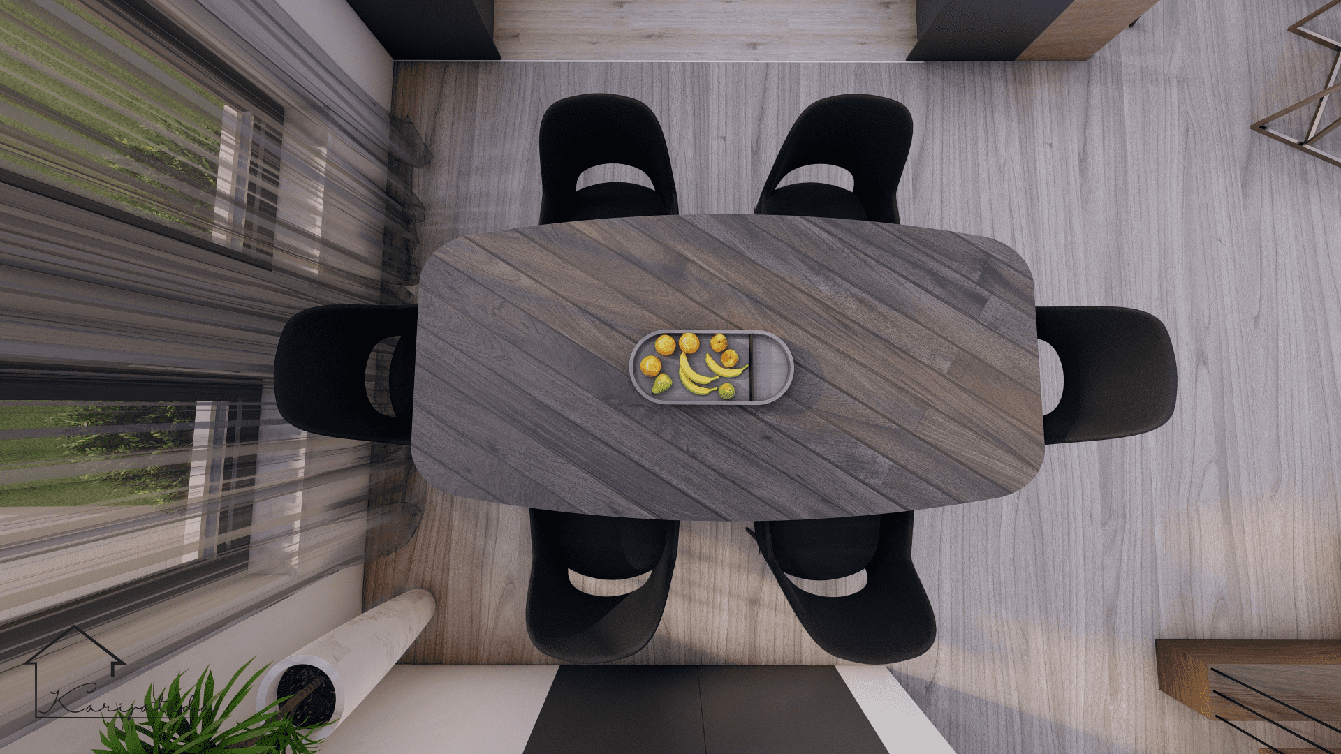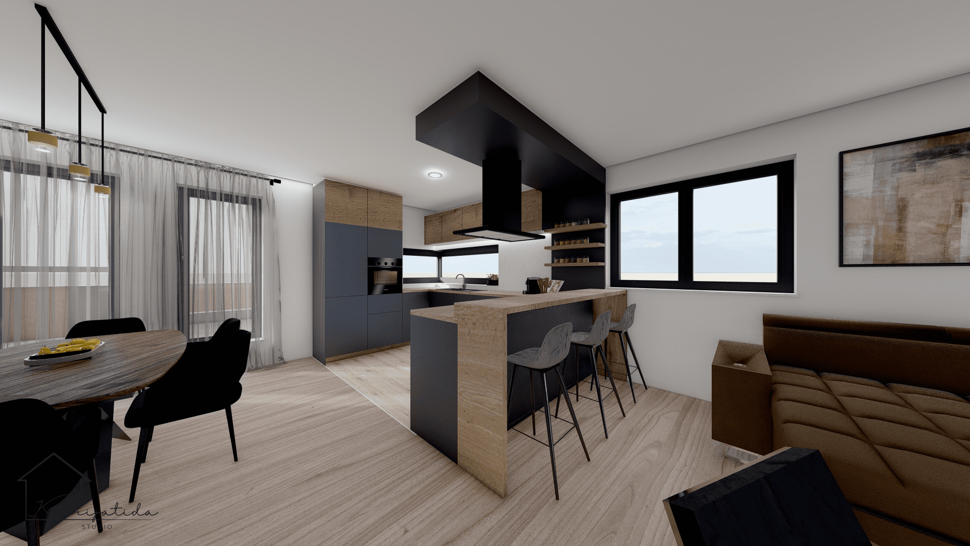 Tamnija paleta boja u kombinaciji sa svijetlim dekorima drveta prostoru je dala moderan izgled što je i bila želja klijenata.