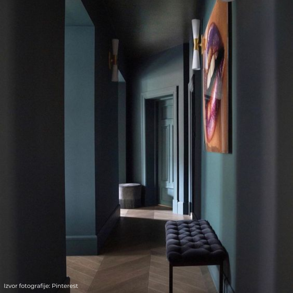 Ipak, bojanje hodnika u tamnu boju može doprinijeti tome da ulaskom iz njega u svijetli prostor. npr. dnevnu sobu, snažni kontrast ostavi iluziju većeg prostora dnevne sobe.