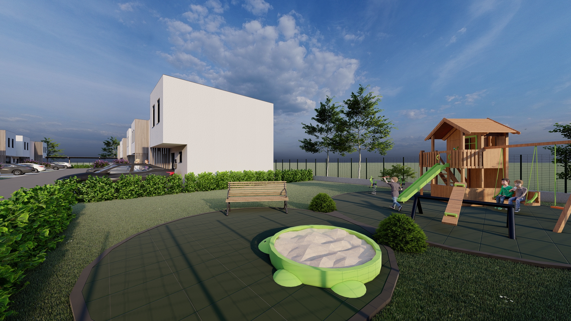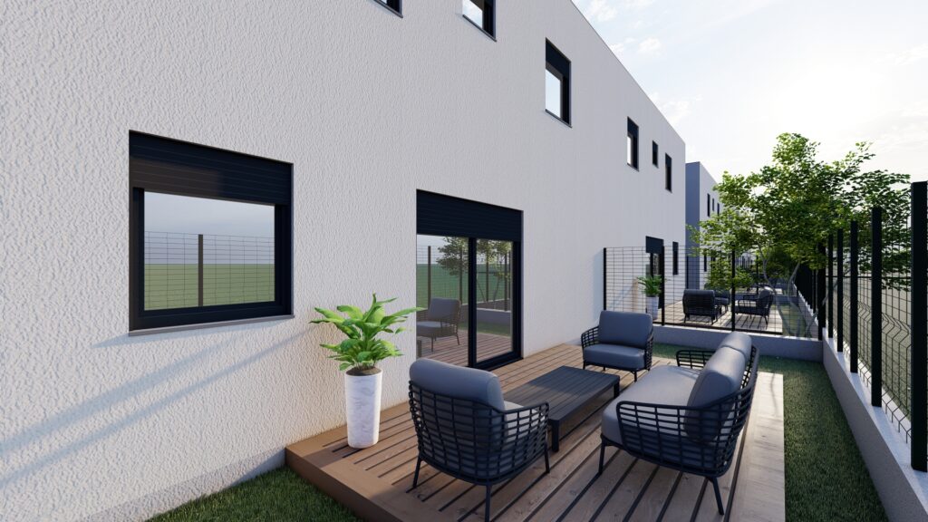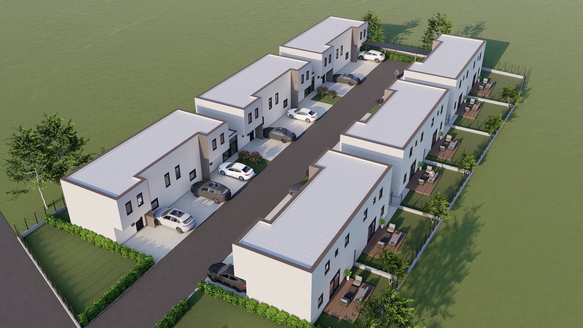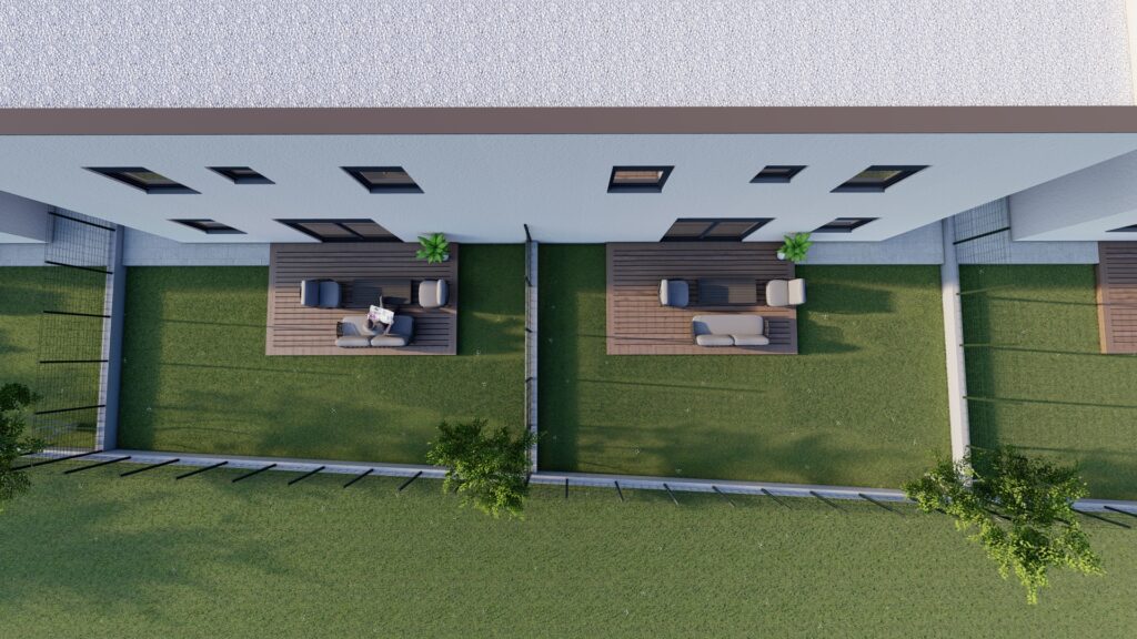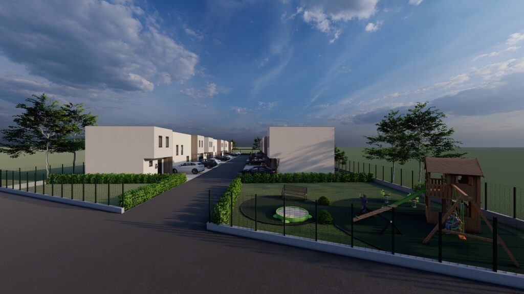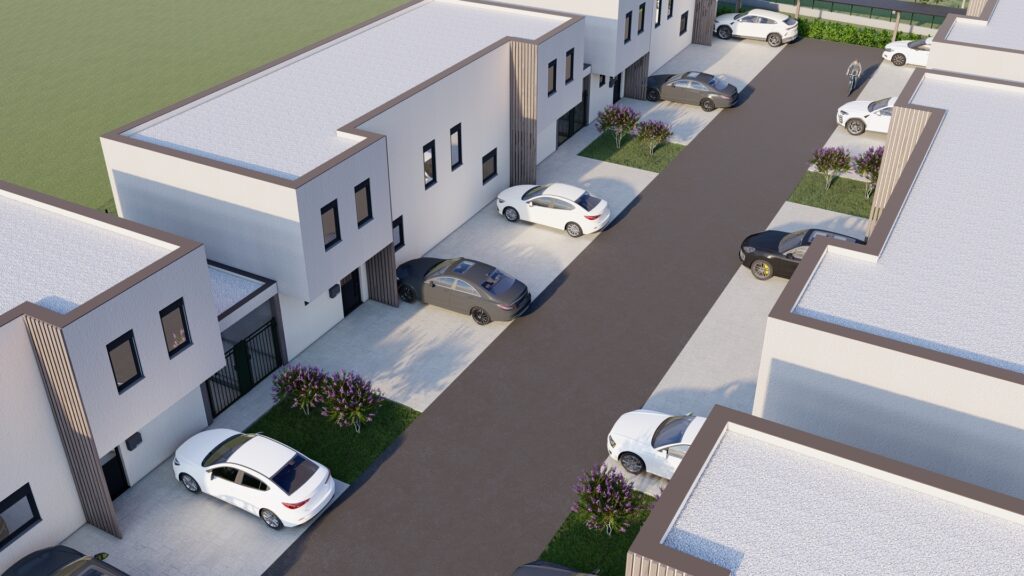 Na građevnoj čestici od 2969 m2 smješteno je šest dvojnih kuća odnosno dvanaest stambenih jedinica.