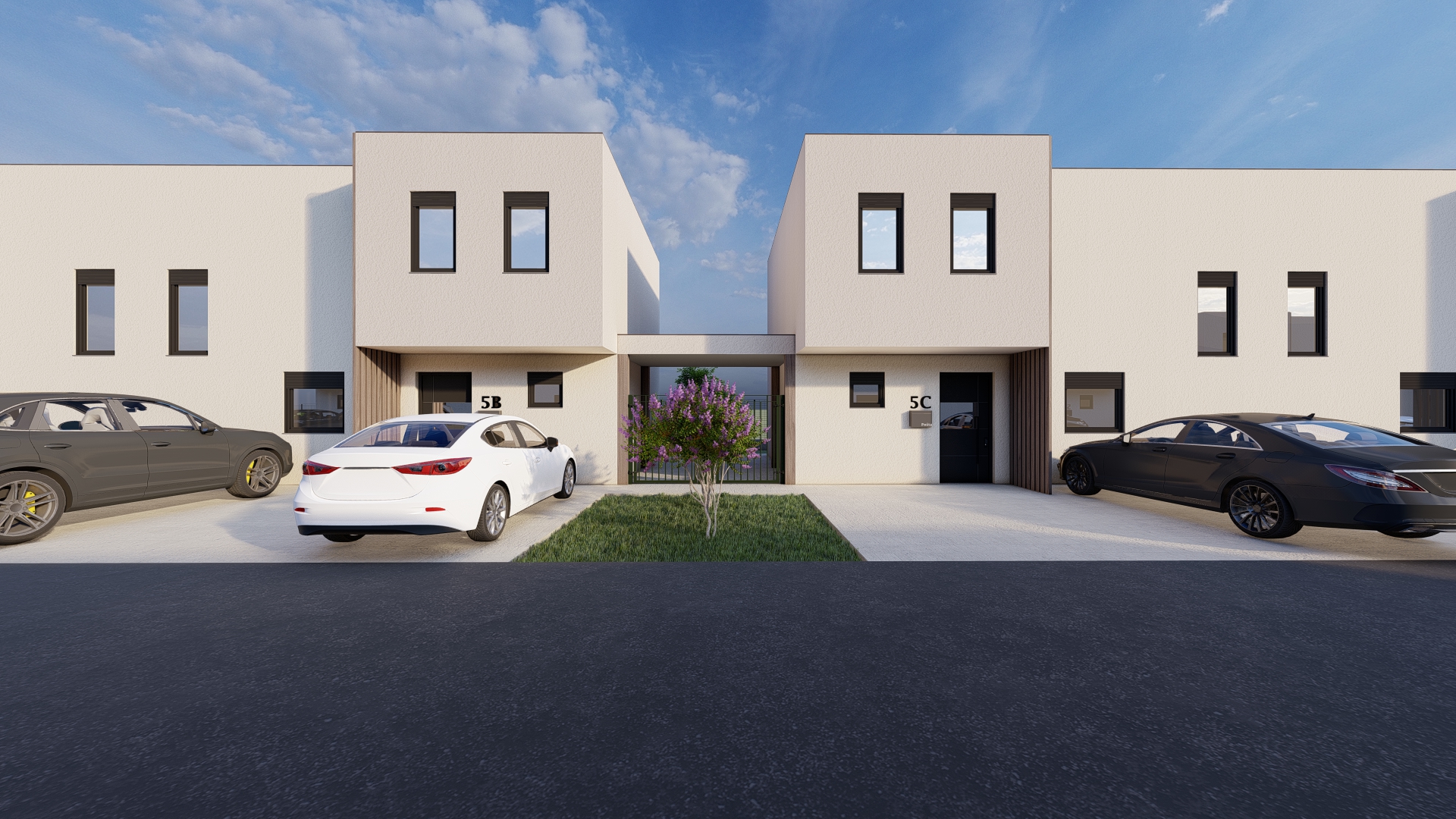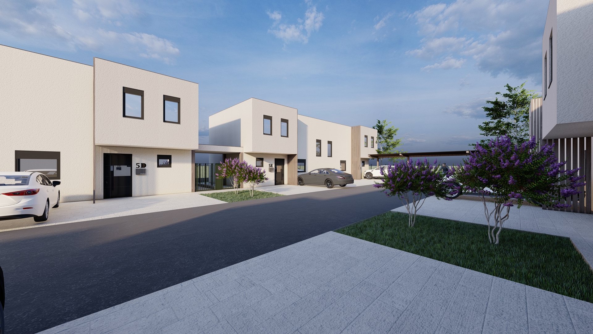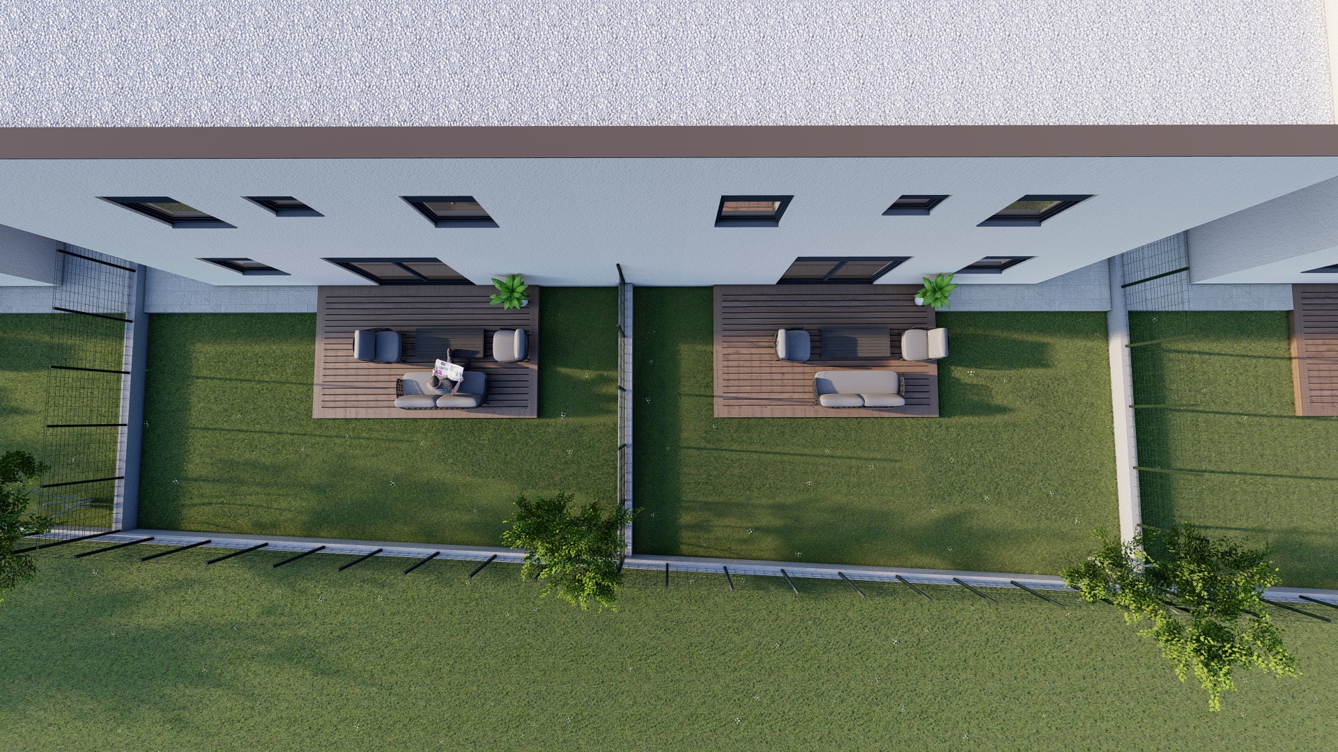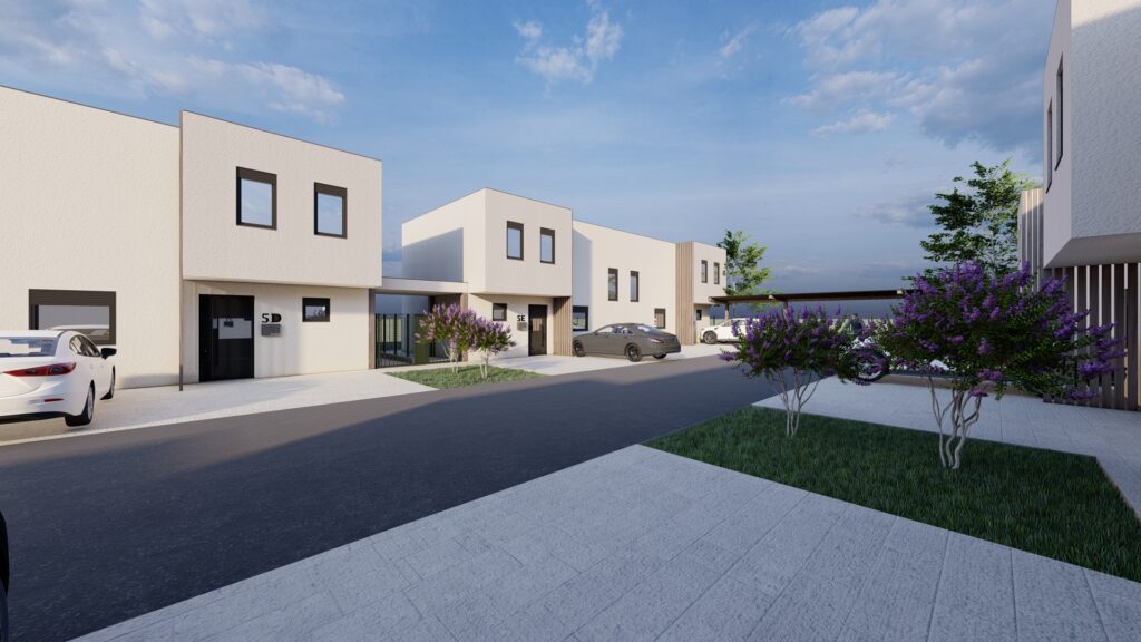 Moderni projekt kuća u nizu osmišljen je kao kompleks šest dvojih kuća.