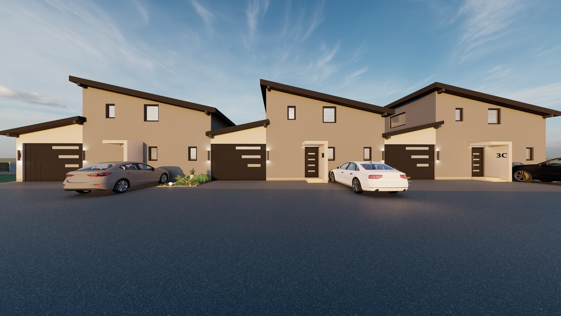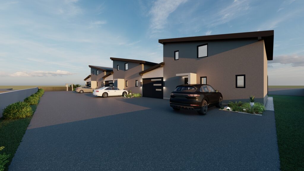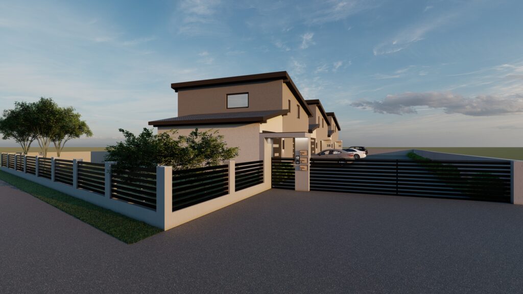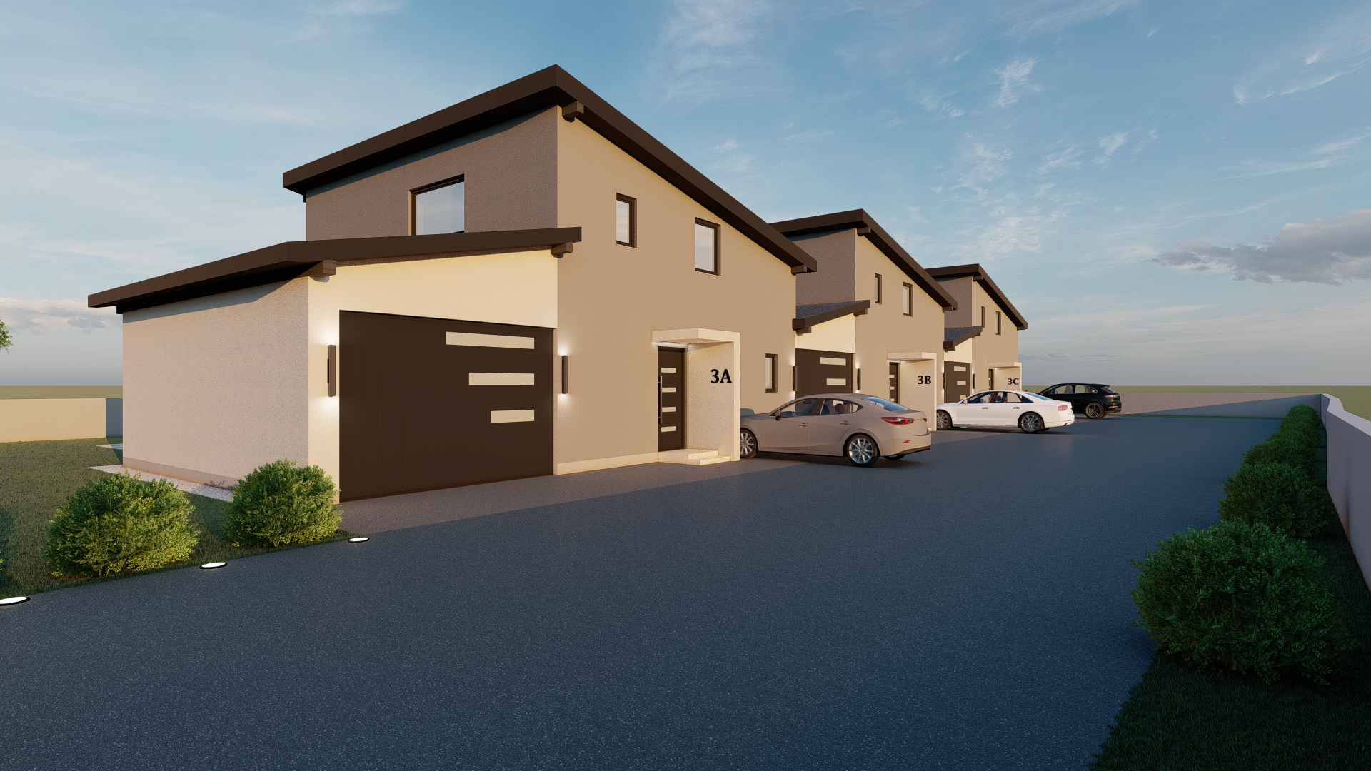 U ovom je projektu tri kuće u nizu s pripadajućim garažama naglasak prilikom projektiranja bio na oku zanimljivom arhitektonskom oblikovanju, što je u dizajniranju eksterijera značilo pridržavati se jednostavne palete boja, staviti naglasak na zelenilo i planirani projekt u potpunosti uklopiti u cjelinu kojoj pripada.