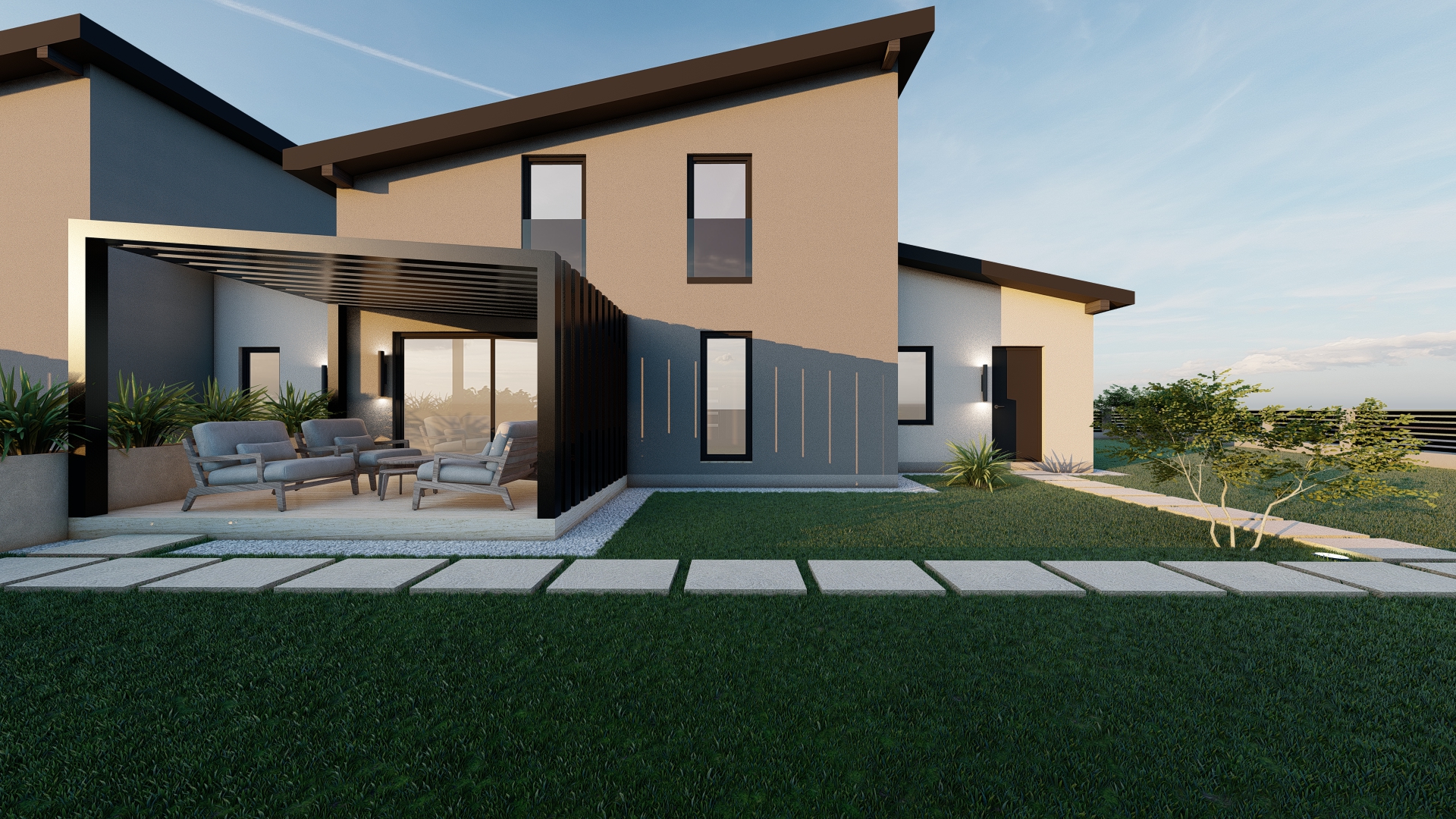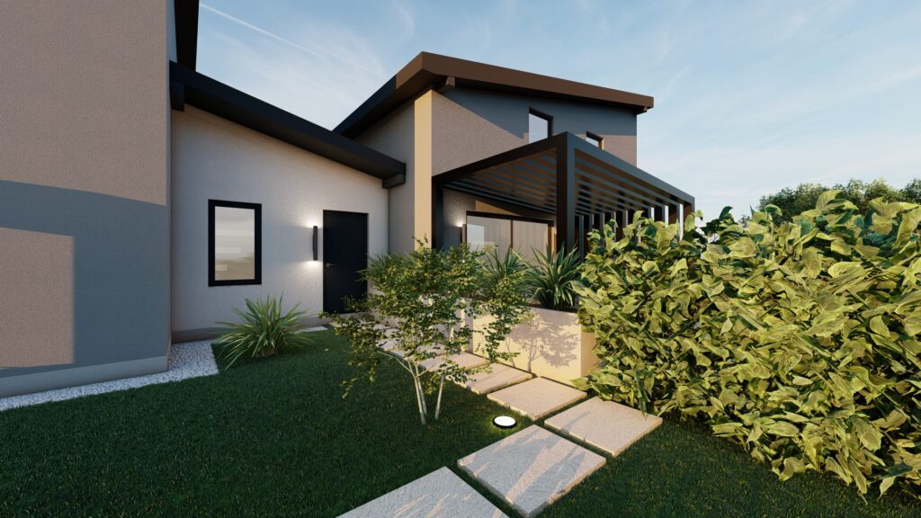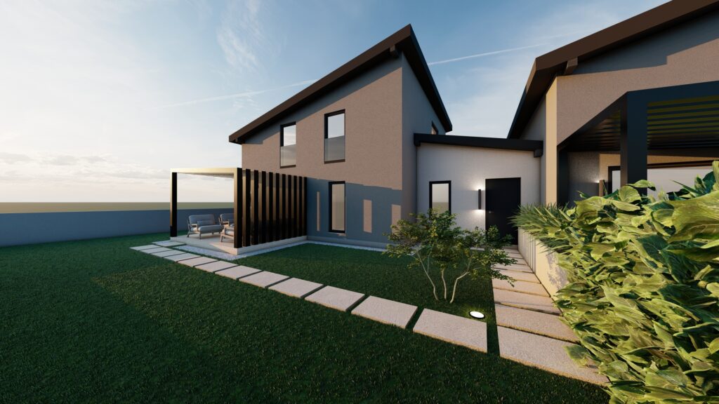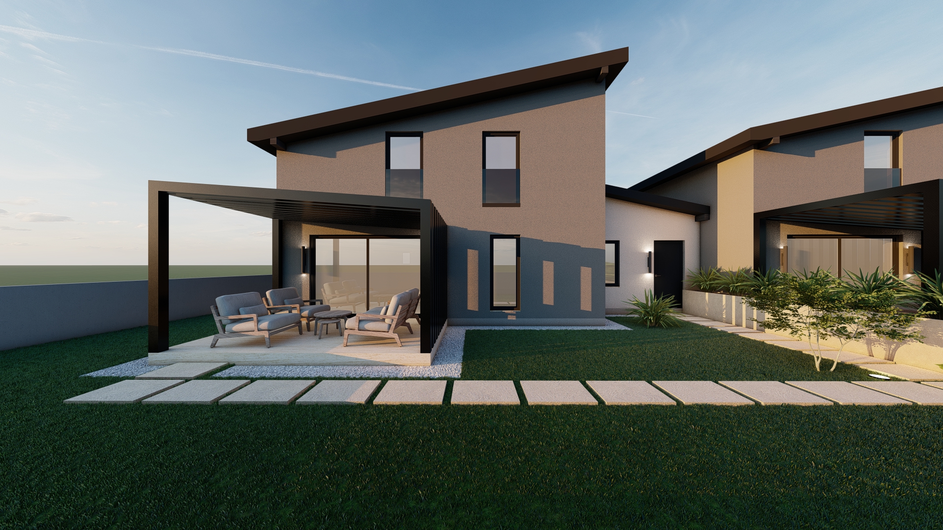 U ovom je projektu tri kuće u nizu s pripadajućim garažama naglasak prilikom projektiranja bio na oku zanimljivom arhitektonskom oblikovanju, što je u dizajniranju eksterijera značilo pridržavati se jednostavne palete boja, staviti naglasak na zelenilo i planirani projekt u potpunosti uklopiti u cjelinu kojoj pripada.
